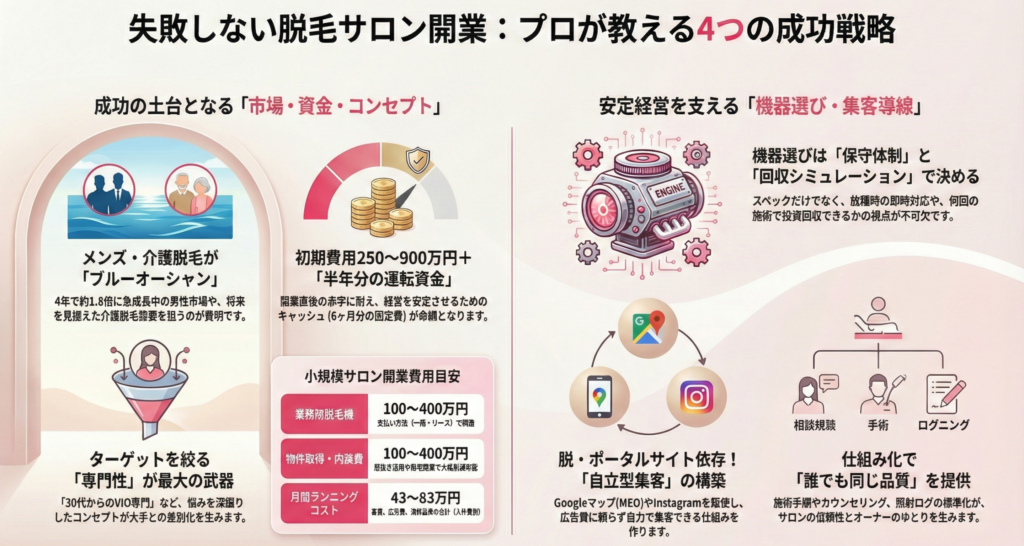 脱毛サロン開業は、小資本で始められる魅力的なビジネスです。しかし、市場が成熟する中で、成功には明確な戦略が不可欠となります。本記事では、市場の全体像から資金調達、集客、そして「続く」サロン運営の秘訣まで、私たち株式会社イレブンのコンサルタントが、特に女性オーナーの視点に立ち徹底解説します。