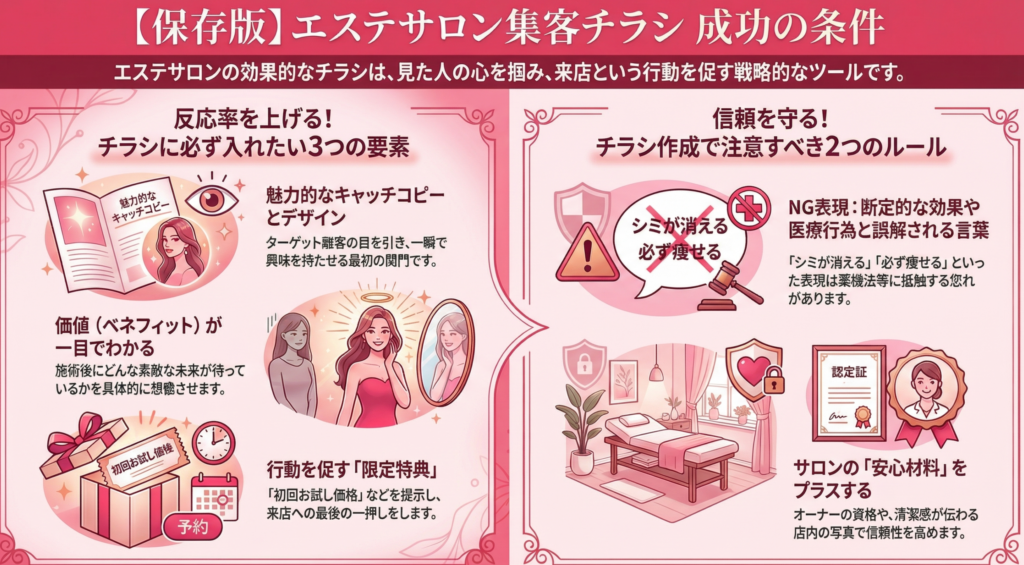 Web集客が主流の今でも、地域密着型のエステサロンにおいて「チラシ」は最強の武器になります。しかし、ただ撒くだけではゴミ箱行きです。株式会社イレブンのコンサルタントとして多くのサロンを支援してきた経験から、反応率を劇的に高める「紙×デジタル」の戦略と、絶対に避けるべき法的なNG表現を徹底解説します。