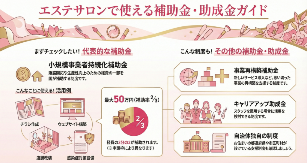 この記事では、エステサロンの新規開業準備から、すでに運営されているサロンの設備投資、販路開拓、IT化による業務効率アップまで、様々なステージで役立つ可能性のある補助金・助成金について、その種類や特徴、注意点を分かりやすく解説します。