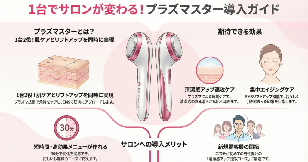 新規集客が難しく競合が増える時代、サロンが生き残るためには他店にはない特徴や確かな効果を持つ美容機器の導入が不可欠です。美容業界で注目される ハンド型プラズマ美容機器「プラズマスター」 は、そんなニーズに応えるアイテム。ここでは、導入を検討するオーナー様へ向けて、ビジネス視点のメリットをご紹介します。