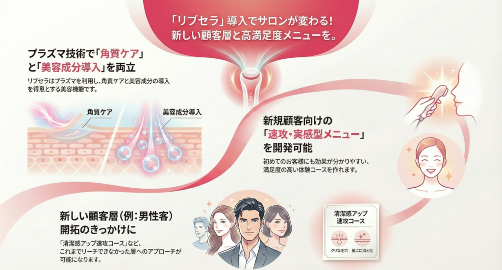 リブセラは、美容医療で用いられる「低温プラズマ」をエステ向けに最適化したフェイシャル&スカルプ機器。プラズマ放電により角質細胞間を一瞬ゆるめ、美容成分が深部へ浸透しやすい状態をつくります。レーザーや光と違い熱ダメージが極めて少なく、施術直後からメイクも OK。まぶたや唇のキワまでケアできる希少性が評価されています。