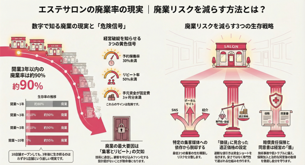 | 主な廃業要因 | 在庫過多による資金不足 | 集客難・スタッフの離職 | 待っていてもお客様は来ず、スタッフがいなければ売上が作れません。 |