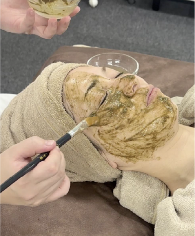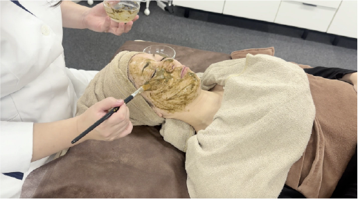 リバイブハーブパウダーを専用液でペースト状にし、顔の右と左を半分ずつ内から外に向かうよう筆でハーブを塗布。ハーブが乾かないように手早く塗布するのがポイント。