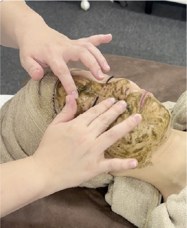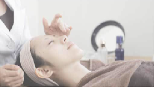 目の周りなど顔のツボを約10分ほど優しくマッサージ。ハーブが乾燥しないように専用化粧水を足しながら浸透させる。