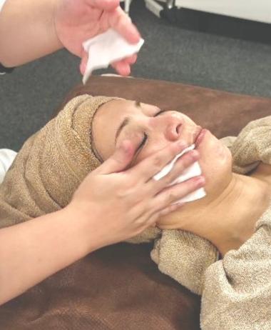 コットンに専用化粧水を染み込ませ、顔を内から外に向かって塗布。擦らないように注意し乾燥箇所は丁寧に入れ込む