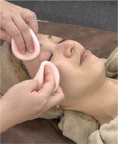 専用化粧水を含ませたコットンで顔全体をパックする。10〜15分程度おく